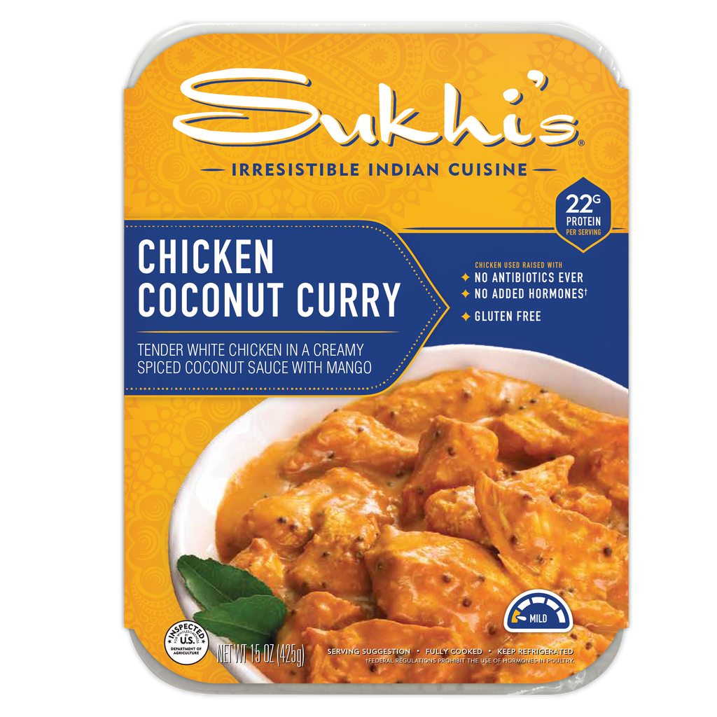 Our Chicken Coconut Curry is bursting with coastal flavors from South India. This rich creamy curry has the perfect amount of heat and is balanced with creamy coconut milk, mango chutney and tangy tomatoes. Served with Sukhi’s Lemon Rice, this entrée is a perfect addition to your dinner table.