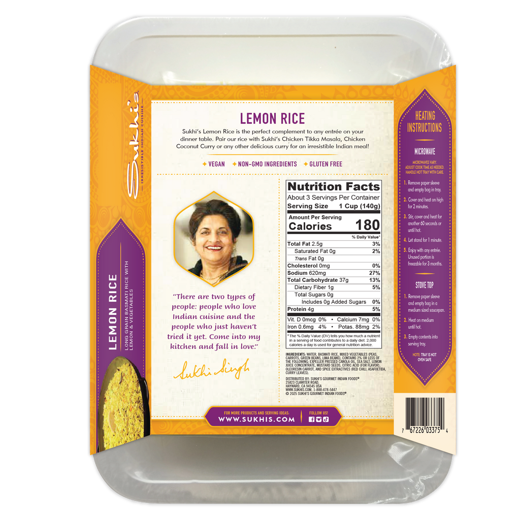 Sukhi’s Lemon Rice is the perfect complement to any entrée on your dinner table. Pair our rice with Sukhi’s Chicken Tikka Masala, Chicken Coconut Curry or Tandoori Chicken for an irresistible Indian meal!