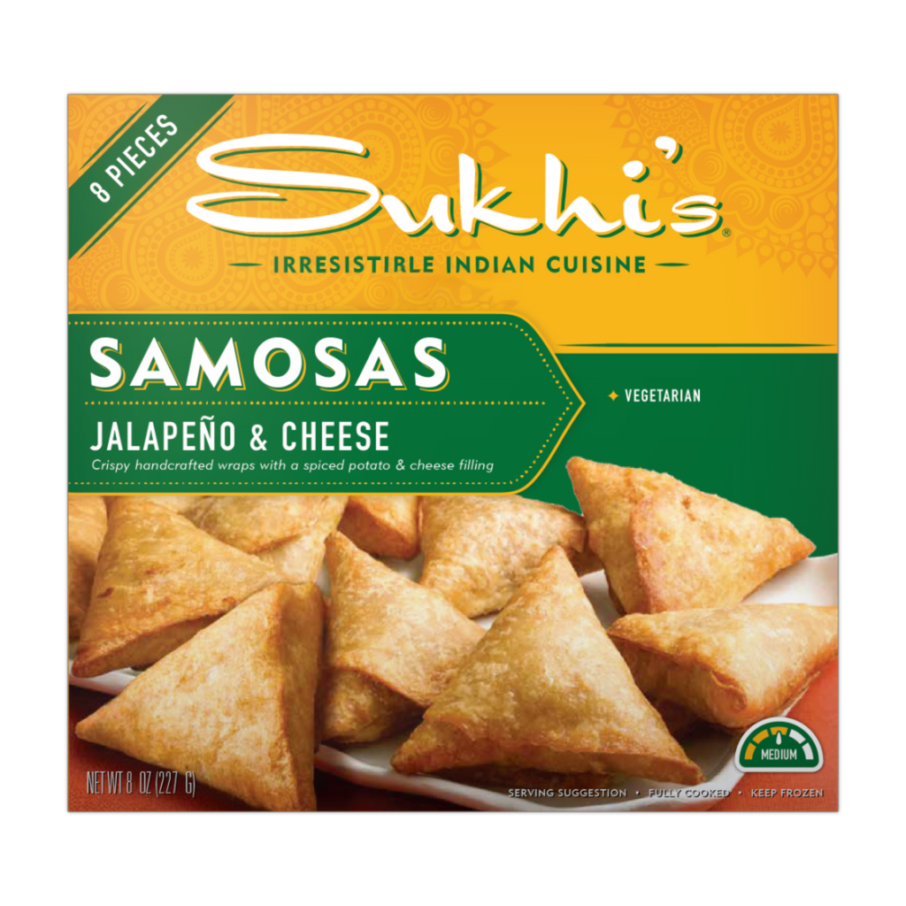 Sukhi’s Jalapeño & Cheese Samosas are crispy handcrafted triangles filled with seasoned potatoes, jalapeño peppers, cheddar cheese, and Sukhi's signature tomato-onion sauce. Savory goodness in every bite. Perfectly sized for an appetizer or snack, they will spice up any occasion.